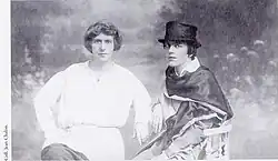Despite being a lesbian, on June 13, 1903, Goddard married her friend John Ellingham Brooks and acquired British nationality.[4] Brooks was an unsuccessful pianist and translator who was in deep financial difficulty. He was homosexual as well, and Goddard never revealed exactly why she married him. Her first biographer Meryle Secrest suggests that she was motivated by concern for him and a desire for companionship, rather than the need for a marriage of convenience. They quarreled almost immediately when she cut her hair and ordered men's clothes for a planned walking tour of England; he refused to be seen in public with her dressed that way. Chafing at his desire for outward propriety, she left him after only a year and moved to London. His repeated references to "our" money frightened her, as the money was her inheritance and none of it his.[11] After they split, she continued to give Brooks an allowance of 300 pounds per year. He lived comfortably on Capri, with E. F. Benson,[12] until he died of liver cancer in 1929.[13]