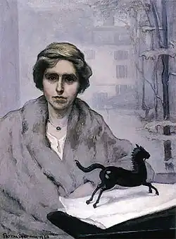 Brooks's portrait of Barney has a softer look than her other paintings of the 1920s. Barney sits, swathed in a fur coat, in the house at 20 Rue Jacob where she lived and held her salon. In the window behind her, the courtyard is seen dusted with snow. Brooks often included animals or models of animals in her compositions to represent the personalities of her sitters;[33] she painted Barney with a small sculpture of a horse, alluding to the love of riding that had led Remy de Gourmont to nickname her "the Amazon". The paper on which the horse stands may be one of Barney's manuscripts.[34]