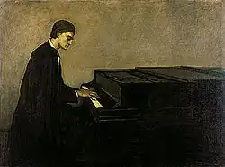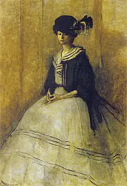 The most widely observed influence on Brooks's painting is that of James McNeill Whistler, whose subdued palette probably inspired her to adopt a monotone color scheme with accents of tinted pigments because through this technique she could suggest a classical restraint and create tensions that were modulated by shape, texture, and variations of shading throughout her canvases. She may have been introduced to Whistler's work by the art collector Charles Lang Freer, whom she met on Capri around 1899, and who bought one of her early works.[66] Brooks said she "wondered at the magic subtlety of [Whistler's] tones" but thought his 'symphonies' lacked the corresponding subtlety of expression.[67] One 1920 portrait may take its composition from a painting by Whistler. While the poses are almost identical, Brooks removes the little girl and all the details of Whistler's domestic scene, leaving only Borgatti and her piano—an image of an artist completely focused on her art.[68]
