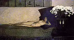 Although they broke up in 1914, Brooks painted Rubinstein more often than any other subject; for Brooks, Rubinstein's "fragile and androgynous beauty"[23] represented an aesthetic ideal. The earliest of these paintings are a series of allegorical nudes. In The Crossing (also exhibited as The Dead Woman), Rubinstein appears to be in a coma, stretched out on a white bed or bier against a black void variously interpreted as death or floating in spent sexual satisfaction on Brooks' symbolic wing;[3] in Spring, she is depicted as a pagan Madonna strewing flowers on the ground in a grassy meadow. When Rubinstein starred in D'Annunzio's play The Martyrdom of Saint Sebastian, Brooks painted her as a blonde Saint Sebastian—tied to a post, being shot with an arrow by a masked dwarf standing on a table. The dwarf is a satiric representation of D'Annunzio.[3][24]