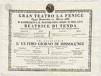 Beatrice di Tenda is a tragic opera in two acts by Vincenzo Bellini, from a libretto by Felice Romani, after the play of the same name by Carlo Tedaldi Fores.[1]