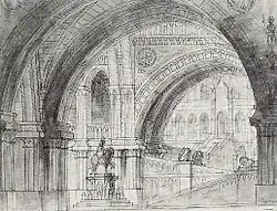Scene 2: "Ground level vestibule above the castle prisons. Beatrice's maidens and servants emerge from the cells. All are mourning. Sentinels everywhere"