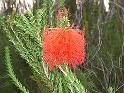 The flowers are bright orange to red in colour and arranged in bottlebrush-like spikes near the ends of the branches that continue to grow after flowering. The flowers have 5 sepals, 5 petals and 5 bundles of stamens each containing about 5 stamens. The hypanthium is about 2 millimetres (0.08 in) long but the stamens, which give the flowers their colour, are up to 26 millimetres (1 in) long. Flowers are produced from January to April and from September to November and are followed by fruits which are woody capsules which are retained on the stems indefinitely.[2][3][4]