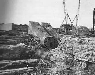 The present Beauharnois Canal was built between 1929-1932 on the south side of the St. Lawrence River, measuring 20 kilometres (12 mi)[1] or 24.5 km (15.2 mi) [3] in length, with a minimum depth of 8 metres (26 ft) and width of 182 metres (597 ft).[1] This canal was built as part of a hydroelectric development at Beauharnois which saw a dam and power house built to take advantage of the 24 metres (79 ft) drop between Lake St. Francis and Lake St. Louis. Some of the electricity is used to power a large aluminum smelter in Beauharnois.