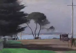 Clarice Beckett (1887–1935) now highly regarded as an original Australian modernist,[87][88] moved with her elderly parents from Bendigo to St. Enoch's, 14 Dalgetty Rd., Beaumaris in 1919 to care for them in their failing health, a duty that severely limited her artistic endeavours so that she could only go out during the dawn and dusk to paint her landscapes. Nevertheless, her output was prodigious; she exhibited solo shows every year from 1923 to 1933 and with groups, mainly at Melbourne's Athenaeum Gallery, from 1918 to 1934. Many of her works depict still recognisable places along the coast as well as everyday 1920s suburban street scenes. While painting the wild sea off Beaumaris during a big storm in 1935, Beckett developed pneumonia and died four days later in Sandringham hospital, at age 48.[89] In the municipal council, the Beckett ward is named in her memory.