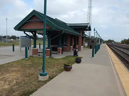 The current station building and adjacent police substation were constructed in 2012 and opened on September 14 of that year. An earlier station building on the site sustained damage in Hurricane Rita in 2005. That building was removed and only a concrete platform was left for six years until the current replacement station was built. A portion of the construction funds for the current station was from $1.2 million in federal stimulus funding.[2] Work was completed in January, 2012.[3][4] The station is constructed of red brick and has an enclosed waiting room. A 550-foot (170 m) platform was also constructed.[5]