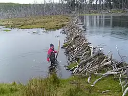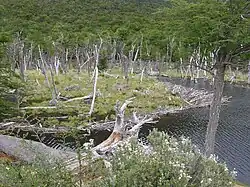 The impact of the beavers on Tierra del Fuego's forest landscape has been described as "the largest landscape-level alteration in subantarctic forests since the last ice age."[12] One factor contributing to their success as invaders is the lack of predators in Tierra del Fuego.[13] Another is the reluctance of local people to hunt beavers,[14] which has led to the beaver population growing almost exponentially. Another factor is that Tierra del Fuego provides exceptional habitat for beavers, with much of the area being close to watercourses, and forested with trees and other plants that provide sources of food and shelter.[15]