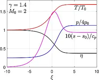 The analytical solution is plotted in the figure for and . The notable feature is that the entropy does not monotonically increase across the shock wave, but it increases to a larger value and then decreases to a constant behind the shock wave. Such scenario is possible because of the heat conduction, as it will become apparent by looking at the entropy equation which is obtained from the original energy equation by substituting the thermodynamic relation , i.e.,