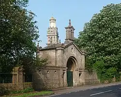 Henry Goodridge designed a Byzantine entrance gateway to the grounds.[36] Bronze railings were later added which had surrounded Beckford's original tomb in Bath Abbey Cemetery.[37] The railings were removed during World War II and replaced in 2000.[38] The gardens were surrounded by stone walls around 2 metres (6 ft 7 in) high.[39]