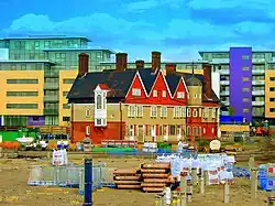 In more recent times, industry has left the area, leaving huge areas of brownfield land, and Beckton has been redeveloped as part of the Docklands project. It now comprises mainly housing and several out-of-town shopping centres, and the architecture is mostly post-1982. Small areas of Victorian housing survive in Winsor Terrace, originally built as accommodation for Gas Light and Coke Company staff, and in the 'Nottingham' estate off Prince Regent Lane. It is served by local buses and Beckton DLR station, which acts as the terminus of the DLR's Beckton branch.[2]
