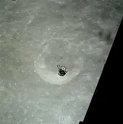 ![]() Oblique view of Bečvář from Apollo 17, facing north. Bečvář X is at top near center, Bečvář Q is below left of center, and Bečvář J is partially visible in lower right. | |