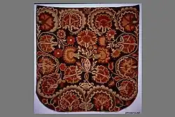 Some examples have rounded corners for the bottom of the bed, and a straight edge for the top.[3] They were often signed or initialed and dated, possibly due to the large amount of work required to make them.[4]: 34 [5]: 107 They were produced in the 17th through early 19th centuries.[5]: 105  Bed rugs began as carpet-like textiles, and were more common in 18th century than floor rugs.[4] In his Draper's Dictionary (1882), William Beck noted that the term rug was only used in America to describe the coverings for ordinary beds.[6]: 1