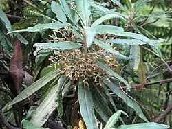- The young branches and lower surface of leaves and the whorl that surrounds the flower heads are densely covered with short matted and stellate hairs.[2]