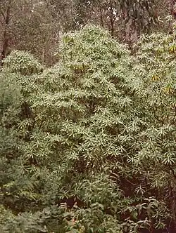 Whilst in no way related, the first impression of a healthy stand of blanket tree is strongly reminiscent of the rhododendrons of the Himalayas and China. This is due to similar growth habit, leaf arrangement and shape, and is consistent with a plant which grows in the middle vegetation layers, and which has the role of shading the ground.