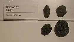 Bediasites are part of the 34-million-year-old North American strewnfield coming from the Chesapeake Bay impact crater.[4] Two strewnfields and tektite groups are associated with this impact: the black Bediasites in Texas and the green Georgiaites in Georgia.[5]