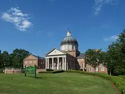 The focal point of the divinity school is Andrew Gerow Hodges Chapel, dedicated in 1995 and named in honor of Andrew Gerow Hodges in 2002. Though an original design by Neil Davis of Davis Architects, it was inspired by Il Redentore in Venice designed by Andrea Palladio. The interior features three cycles of iconography. In the dome are sixteen prominent figures from Christian history representing a variety of theological traditions. It was inspired by a passage in chapter 12 of Hebrews. in the transept apses are ten painting depicting days or seasons of the Christian year, beginning with Advent and ending with Reformation Day. Both of these cycles were painted by the Romanian artist Petru Botezatu. The third cycle are six busts in cultured marble of 20th-century Christian martyrs from each of the six inhabited continents. These were made by Martin Dawes of Cherrylion Studios. These are in the crossing and aisles.[4][5]