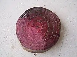 Symptoms can be found on both beet roots and foliage, although foliar symptoms are not always present. If present, foliar symptoms include dark streaking along petioles and viscous froth deposits on the crown which are a by-product of bacterial metabolism.[12] Petioles can also become necrotic and demonstrate vascular necrosis. When roots become severely affected, wilting also occurs.[1] Below ground symptoms include both soft and dry root rot. Affected vascular bundles in roots become necrotic and brown, and tissue adjacent to necrosis becomes pink upon air contact.[1] The plants that do not die completely may have rotted-out, cavernous roots.