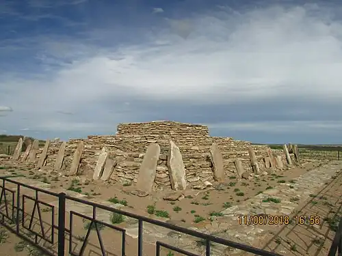 Most visible monuments are about 20 constructively and architecturally unusual megalithic mausolea. As a rule, mausolea are fenced with square or oval layout of two or three stone masonry walls or stone slabs up to 3 tons each encircling a central room and covered by slabs as a perimeter gallery with diameter up to 30 m, and with occasional entrance chamber. The central roof-covered chamber is built with stones and multiple square pillars that support the roof, enclosing a massive sarcophagus. Mausolea are surrounded by ordinary kurgan burials. The cemeteries are close to large settlements extending to 10 ha., with housesbuilt of granite slabs, with pillars and thick walls, connected by corridors.[7]