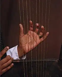The begena is characterized by a very specific buzzing sound, due to U-shaped leather pieces placed between each string and the bridge. The thong for each string is adjusted up or down along the bridge so that the string, when plucked, repeatedly vibrates against the edge of the bridge.