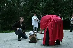 Beheading the Kite (Kashubian: Scynanié kanie, Polish: ścinanie kani) is a Kashubian Midsummer Eve custom of ritually beheading a kite, a bird which in the Kashubian region used to symbolize evil.[1] Since mid-19th century the ritual has become a part of Midsummer Eve, Whit Sunday or Corpus Christi celebrations. After all the residents have gathered, the village elder and village council publicly condemned the captured kite, blaming it for evil deeds, and sentenced it to death by beheading.[2] Whenever a kite could not be captured alive, a hen or a crow could be used instead.[1]