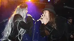 Heidi Parviainen and Juha-Pekka Leppäluoto singing live as the characters "Dark Sarah" and "The Dragon" at a concert in November 2017