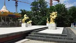 The entrance to the park is made up of a Gothic castle, Roman corridor, and granite relief sculptures. Immediately inside the gate is an Italian-style terrace garden with grand staircases, fountains, and sculptures inspired by originals from the European Renaissance. More lawns and gardens are scattered throughout the park. On these lawns are miniature models of around 100 of the world's most famous statues including the American Statue of Liberty, Copenhagen's Little Mermaid, Michelangelo's David, and the Venus de Milo.[1] Once inside the gates, Beijing World Park consists of two main parts: the scenic portion and the shopping, dining, and entertainment area.