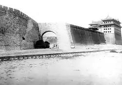 During the Ming and Qing dynasties, the principal defensive weapons were firelocks, cannons, and bows and arrows. In 1629, Houjin troops attacked Beijing, and in 1644, Li Zicheng's troops laid siege to Beijing. Troops atop the city walls used cannons extensively during both sieges.[8] During the Second Opium War (1856–1860), invading troops stationed outside the city walls gave up, because Beijing was too extensively protected. Between 13 August and 15 August 1900, when the Eight-Nation Alliance invaded Beijing, the fortifications withstood bombardment by cannon attacks for two full days before being overrun. The Qing forces took full advantage of their higher elevation and the protection of the thick walls to shoot Alliance troops. Russian and Japanese forces attempted several times to use nitrocellulose to blow a gap in the wall at Dongzhimen and Chaoyangmen, but failed because the soldiers could not get close enough to light the fuse without being shot.[9] The barbicans, enemy sight towers, and corner guard towers proved to be quite effective at deterring enemy attacks. For example, on the night of 13 August, Russian troops succeeded in invading Dongbianmen's watchtower, but suffered heavy casualties in the barbican. It wasn't until the late morning of 14 August that they conquered the gate tower at Dongbianmen, a mere 50 metres (160 ft) away.[10] Even after the Outer City and Inner City fell to Alliance forces, the Imperial city's defenses still held. On the morning of 15 August, American forces used several guns to try to destroy the Tiananmen gates, but they held. Japanese troops used ladders to scale the wall and open the gates, thus allowing Alliance troops into the Imperial city.[10] In an incident on 25 July 1937, a battalion of Japanese troops camped at Fengtai District, declaring that they intended "to protect Japanese immigrants" and "to protect Dongjiaomin Street's Embassy district", tried to advance into Beijing. When they began entering Guang'anmen, around twenty Chinese soldiers fired on them from atop the gate tower, forcing them to abandon their plan. Thus even in the modern era of the 1930s and 1940s, the dilapidated fortifications were still useful defensively.