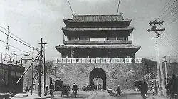 Dongzhimen (東直門 lit. 'Eastern Upright Gate') was located on the northern section of the Inner city eastern wall. It was built on the location of the Chongrenmen (崇仁門) gate of the Yuan era, the central gate of the eastern city wall of Dadu. In 1419 the name was changed, quoting "东方盛德属木、为春" and "直东方也,春也".[19] Dongzhimen's gate tower was built in the multi-eaved Xieshanding style, with grey tiles with green glazed edges. The barbican was built during the final years of the Yuan dynasty (ended 1368). The temple had no proper statue of Guandi; a minor deity made of wood was located there instead. This gave rise to the old Beijing saying: "Nine gates, ten temples, one without morality". The sluice gate towers and the barbican were dismantled in 1915 when the circum-city railway was built. The watchtower was dismantled in 1930 and its platform in 1958. The gate tower was dismantled in 1965.