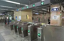 Each station has two to fifteen ticket vending machines.[18] Ticket vending machines on all lines can add credit to Yikatong cards.[19] Single-ride tickets take the form of an RFID-enabled flexible plastic card.