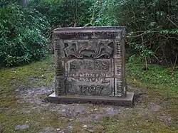 This mansion house and estate stood on the outskirts of Beith in an area now cut through by the main Dalry to Glasgow road. Built for the Kerr family in the 18th century, Crummock was sold in 1815 to William Wilson, who added to the house and improved the grounds. James Dobie, the historian and author,[46] and his family lived here from 1836. Now demolished and a housing estate built on the site, some boundary walls and a cottage remain. Historic stones which had been built into the kitchen garden were donated to the North Ayrshire Heritage Centre,[47] including the arched stone known as the shrine.[48] Images of these shrine stones can be viewed in The Gallery section below. A plaque remembering James Dobie resides in Beith Auld Kirk.[49]
