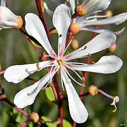 Tarflower is an evergreen shrub growing up to 2.5m tall.[3] Its few erect branches support powdery-pubescent stems with simple, alternate, sessile leaves.[3] Leaves are elliptic to ovate in shape and 2–6 cm long and 2 cm wide. Their margin is entire, the leaf tip is rounded to acute, and the leaf base is cuneate. The adaxial (upper) leaf surface is covered in powdery pubescence, while the abaxial (bottom) surface is whitish in color with long hairs along the midrib.