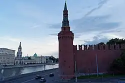 Beklemishevskaya Tower (Russian: Беклемишевская) is a tower at the Eastern edge of Moscow Kremlin Wall. It was named after a boyar Ivan Bersen-Beklemishev, whose house had been adjacent to the tower from the Kremlin side. It was earlier known as Russian: Москворецкая tower based its position on the near Moskva River. It is similar to the other two towers standing at the other corners of the Kremlin triangle, Vodovzvodnaya and Uglovaya Arsenalnaya rowers. While these towers are cylindrical, all other towers of the Kremlin's Wall have been built on a square plan base.
