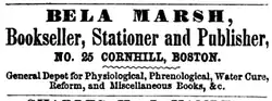 Bela Marsh (1797-1869) was a publisher and bookseller in Boston, Massachusetts, in the 19th century.[1] Authors under his imprint included Spiritualists[2] and abolitionists[3][4] such as John Stowell Adams, Adin Ballou, Warren Chase, Lysander Spooner, and Henry Clarke Wright. Marsh kept offices on Washington Street (ca.1820-1832),[5] Cornhill (ca.1847-1852),[6] Franklin Street (ca.1854-1856),[7] and Bromfield Street (ca.1858-1868).[8]