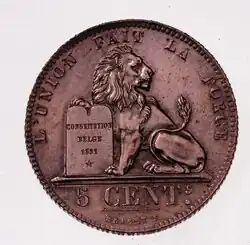 The Constitution depicted as the Tablets of Stone on a Belgian coin, guarded by the Belgian lion