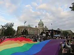 ![]() 2021 Belgrade Pride in front of the House of the National Assembly of the Republic of Serbia | |