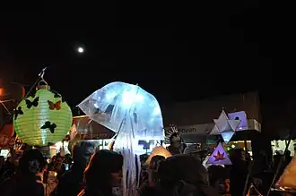 The Belgrave Lantern Festival (Belgrave Lantern Parade) is an annual celebration of the winter solstice, through community and creativity with a display of hundreds of homemade lanterns.[1] The event takes place in the main street of Belgrave from around 5pm - 7:30pm[2] and attracts thousands of visitors.[3] There are many lantern making workshops held before the parade from around March[4] at the Belgrave Library and other places such as primary schools.[5] The parade is open for everyone who has brought a lantern, and there are entertainers such as belly dancers, fire twirlers and the Ruccis Circus that perform before the parade begins.[6] The lanterns that are brought are a range of sizes, with some so big their owners have to wear them.[7] People start arriving in Belgrave from about 4 pm where they can enjoy bands, choirs and food stalls. The people wishing to take part in the actual parade part of the night are asked to gather in Hayes car park by 5 pm.[8] After the parade, Belgrave Library hosts storytime for children at 7 pm with other activities as well[9] such as face painting[10] There are some lanterns that are remembered by the annual parade-goers such as a Dalek and a TARDIS from the british television show Doctor Who. Some other memorable ones are the fauna inspired lanterns such as the cockatoo, dragonfly and frog.[11]