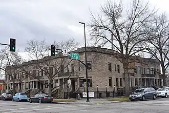 Dr. Jesse K. DuBois, brother of Senator Fred T. DuBois, began construction in 1904 of the DuBois Flats, one of the first apartment buildings in Boise. Designed and built by John S. Jellison, the sandstone and brick building included 21 large apartments with exposure of 140 feet on Main Street and 110 feet on 5th Street. The building also featured Boise's first galvanized iron roof.[2] As the building neared completion in September, 1904, Dr. DuBois became unable to pay his creditors, prompting lawsuits. The Idaho Statesman reported in November, 1905, that "litigation ensued over the failure to pay some of the bills in connection with the flats, and this, octopus-like, spread forth its tentacles until the ingenuity of almost every attorney at the Ada County bar had been drawn into the entangling meshes, as a representative of owner, contractor, laborer, material man, lien holder, mortgagee or other party in interest."[3] The Idaho Supreme Court ruled in the dispute, twice, and some creditors eventually received a portion of due payment.[4][5]