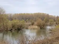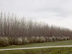 The belt between the inner and outer embankments, and the river, is planted with the forest trees. The forest acts as an obstacle for the high waters and strong winds, protecting the inland settlements (Borča, Kovilovo, Padinska Skela). It forms a sanitary and hygienic belt between the river and the human habitats, while the oxygen production is beneficial even for the settlements across the Danube. The most abundant tree species is the poplar. Poplars have been systematically planted and constantly re-planted as after 20 to 25 years they are being cut for the industrial production. The poplar is known for its fast growth and almost sponge-like absorption qualities, but the water is also absorbed by the humus layer which developed in time on the forest floor.[7] The natural forests are typical gallery forests, consisting of willows and poplars. The cultivated trees are hybridized Canadian poplar.[3]
