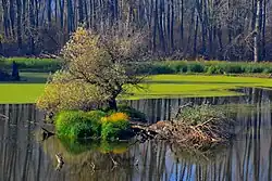 As an elongated floodplain along the Danube, Beljarica is a typical green corridor.[1] The area includes two sizable flood zones, Crvenka (main Beljarica proper) and Kožara. The marshland represents a mosaic of bogs, streams, islands, oxbows, meanders and lush forests and makes a natural riparian zone which receives the surplus of water during the high water level of the Danube, thus preventing the flooding downstream.[2][3] It is not preventing flooding only of its direct hinterland (some 340 km2 (130 sq mi) Pančevački Rit), but also parts of Zemun, New Belgrade and even lowlands upstream the Sava river from its mouth into the Danube.[5][6]