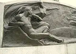 At the memorial's crest is a series of steps leading to the main portion of the monument, a wide mass of white Stanstead granite, faced by the largest single bronze casting created up to that time, which taxed the capacity of its foundry. The sculptor sought to bring out, as the dominant note, the discovery by man of his power to transmit sound through space. Above the reclining figure of man is Inspiration,[Note 9] urging him on to greater endeavors, while, at the other end of the panel are the messengers of Knowledge, Joy and Sorrow, communicating to man by telephone. On both sides of the main portion of the monument are two "heroic" female figures representing humanity in bronze on granite mounts, one depicted in the act of sending, the other of receiving a message over the telephone. The two female figures were positioned some distance apart in order to denote the telephone's power to traverse great distances. Uniting the entire work together is the line of the earth's curvature on the bronze casting, depicting the extent of the telephone's worldwide use.[37] Allward's original proposed design for the monument also included the flags of the greatest nations of the world,[35] a modern element that was likely omitted as it would detract from the monument's neoclassical design.