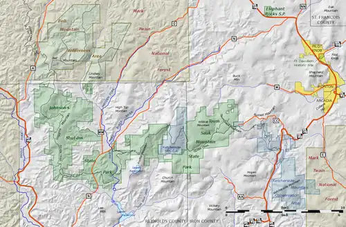 Bell Mountain Wilderness lies in the Saint Francois Mountains and it was named after its highest point, Bell Mountain, which is 1,702 ft (519 m) tall. Several state lands are designated in this parks-and-wilderness area which includes Johnson's Shut-Ins State Park, Taum Sauk Mountain State Park, and several conservation areas.[2]