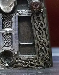 The Bell Shrine of St. Mura is an 11th-century Irish shrine traditionally associated with the Abbey of Fahan, County Donegal, Ireland, founded by Saint Mura (c. 550–645). It consists of a handbell enshrined in a copper container (or shrine), later embellished with silver, gild-silver and rock crystal additions in four phases ending in the 16th century.[2] The first and most significant of the later phases introduced interlace, openwork and filigree patterns.[1]