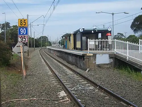 ![]() Southbound view of Platform 2 from the Bellambi Lane level crossing, October 2011 | |||||||||||