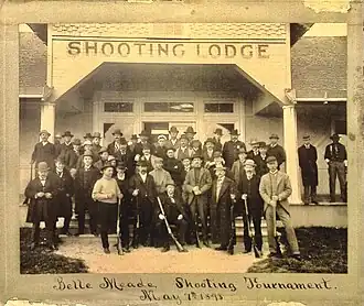 In 1897, General Jackson was a man of wealth and influence in Nashville who had developed the Belle Meade Stud farm, achieving a national reputation for breeding thoroughbred horses.[1]: 261 [2] His avocation was the sport of live bird wing shooting, and this club offered him means to pursue it.[3] The land for the club was part of the 5,400 acres (8.4 sq mi) Belle Meade Plantation, which he controlled; he donated a small parcel of it in 1897 for shooting. For a lodge, he found a structure that had been used in Nashville's Tennessee Centennial Exposition, one of nearly 100 buildings built for the six-month Expo that were never intended to be permanent.[4] When the Expo concluded in October,1897, Jackson purchased one of these buildings and had it moved to the gun club site.[5] The house was finished in hardwood and furnished in wicker.[5] The club's officers included Jackson himself as president and W.R.Elliston as secretary-treasurer.[6][7] Other prominent members were C.B.Cullom, W.H. Jackson Jr., Alex Hunter, W.T. Peyton, Dr. William White, Edgar Foster, and Joe Warner.[6] The members were primarily young society men,[6] but there were also lady members.[3] Lady members included Mrs. William Elliston, Misses Anne Dallas,[8] Louise McClure, and Mildred Williams.[6]