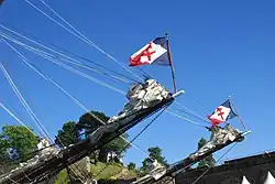 As a former ship of the Free French Naval Forces (French: Forces Navales Françaises Libres, or FNFL), Belle Poule still flies the flag with the Cross of Loraine in honour of her role during the Second World War.[8]