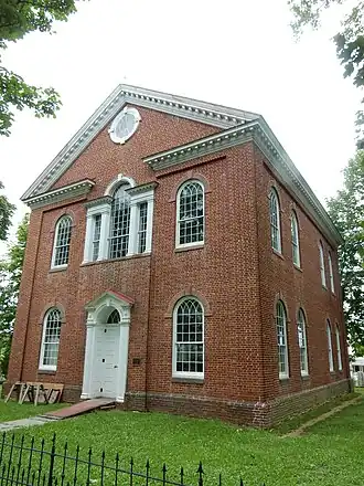 The second church built on the site, the Old Belleman's church, was built in 1814 and added to the National Register of Historic Places in 1973. While it has not been updated for electricity and plumbing, the Georgian-style church features many styles and motifs not seen in many 19th century rural churches. The church embellishes many of the fine points of architecture such as an elaborate cornice, Palladian windows, arched windows, detailed doorways and a gallery. Particular focal points are the wineglass pulpit and a hand-pump organ. The building is used several times per year during warmer months, for Sunday services, weddings, and annual "Hymn Sings" and a service in the Pennsylvania German dialect.[2]