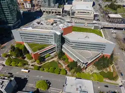 The Bellevue City Hall is a government office building and city hall in Bellevue, Washington. The current city hall, located in Downtown Bellevue, opened in 2006 after the $121 million renovation of a former Qwest data center. The data center, originally built for Pacific Northwest Bell in 1983, was acquired by the city government in 2002 for use by the Bellevue Police Department and later approved as the new city hall. It incorporates use of wood interiors and a terra cotta exterior that has been recognized with several design awards since its opening.