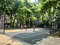 Construction of a $5 million renovation of the park began in May 2022, which includes the replacement of the south playground with an ADA-accessible dog run, reconstruction of the north playground and basketball court, and the installation of community gardens and additional lighting along the central plaza.[1][17] The improvements to the park came as a result of several years of discussions with local residents, a group of which specifically requested an accessible dog run and worked to have a temporary dog run opened in the park at the beginning of 2018.[18][19] Other community members wanted to improve the safety of the park by moving the adult fitness equipment away from the playgrounds and removing park benches to dissuade the homeless from loitering near the areas where children play.[20] The renovations to the park were completed in June 2023.[21]