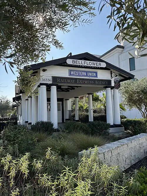 The depot site was established in 1905 with the commencement of service along the Santa Ana Branch. Early maps use the former name of the town for the stop: Somerset. A new expanded station was built in 1927.[4] Bellflower became the southeast terminus of the line after 1950 as service was cut back from Santa Ana.[5] Passenger service ceased after May 24, 1958.[6]