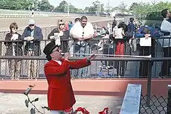 NYRA bugler Sam Grossman plays "Call to the Post", heralding the horses as they enter the track before a race at Belmont Park.